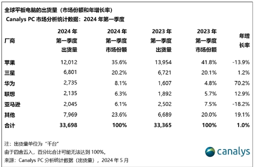 Canalys最新數據顯示,2024年第一季度,全球平板電腦出貨量繼連續四個(gè)季度下滑后首次實(shí)現小幅增長(cháng)。蘋(píng)果以1200萬(wàn)臺出貨量,仍占據最高市場(chǎng)份額。但在前四大廠(chǎng)商中,只有蘋(píng)果的出貨量同比下滑13.9%,其余廠(chǎng)商均取得增長(cháng),且蘋(píng)果的市場(chǎng)份額從去年同期的41.8%下滑到35.6%。