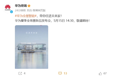 華為官宣,5 月 15 日夏季全場(chǎng)景發(fā)布會(huì )將帶來(lái)全屋智能新品“未來(lái)之家”。