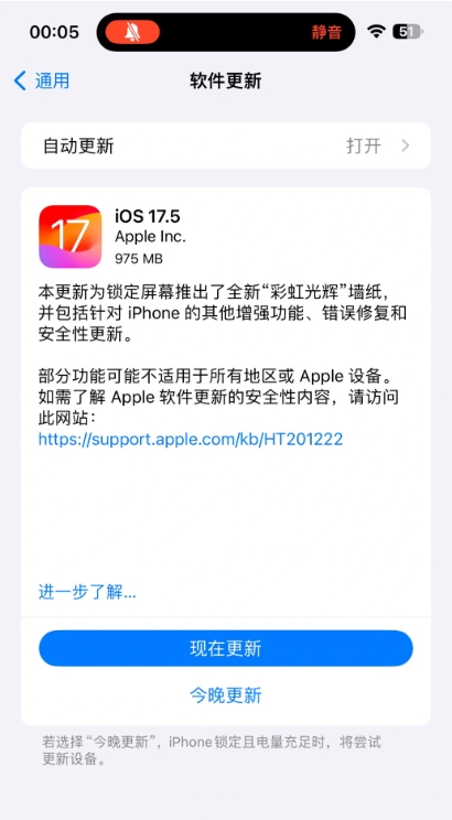 國行版更新內容顯示,本更新為鎖定屏幕推出了全新“彩虹光輝”墻紙,并包括針對 iPhone 的其他增強功能、錯誤修復和安全性更新。