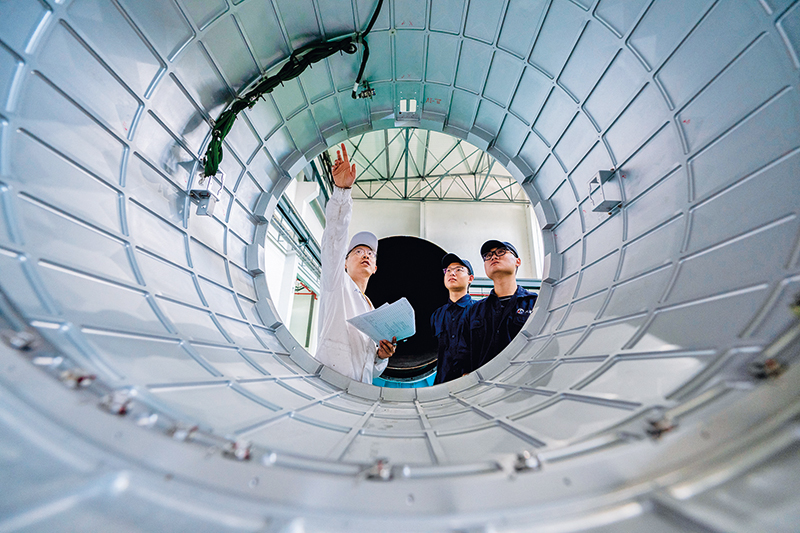 航天科工火箭技術(shù)有限公司快舟火箭結構設計師(左)與裝配人員討論火箭艙段裝配要點(diǎn)(2024年6月3日攝) 胡競文攝/本刊