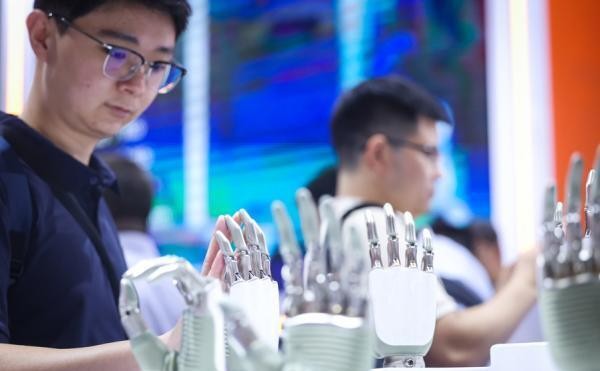 WAIC上,展示了模擬人體手部運動(dòng)的高靈敏度末端執行裝置,由手掌、手腕、五個(gè)手指、電機、傳動(dòng)部件等部分組成。