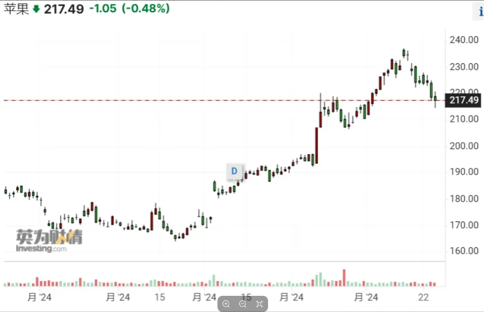 截至美股周四(7月25日)收盤(pán),蘋(píng)果下跌了0.48%,周五(7月26日)盤(pán)前,蘋(píng)果股價(jià)略微上漲。而在上周,蘋(píng)果股價(jià)刷新歷史新高。在“全球開(kāi)發(fā)者大會(huì )”(WWDC)推出“蘋(píng)果智能”以來(lái)一個(gè)月,蘋(píng)果股價(jià)持續走高。