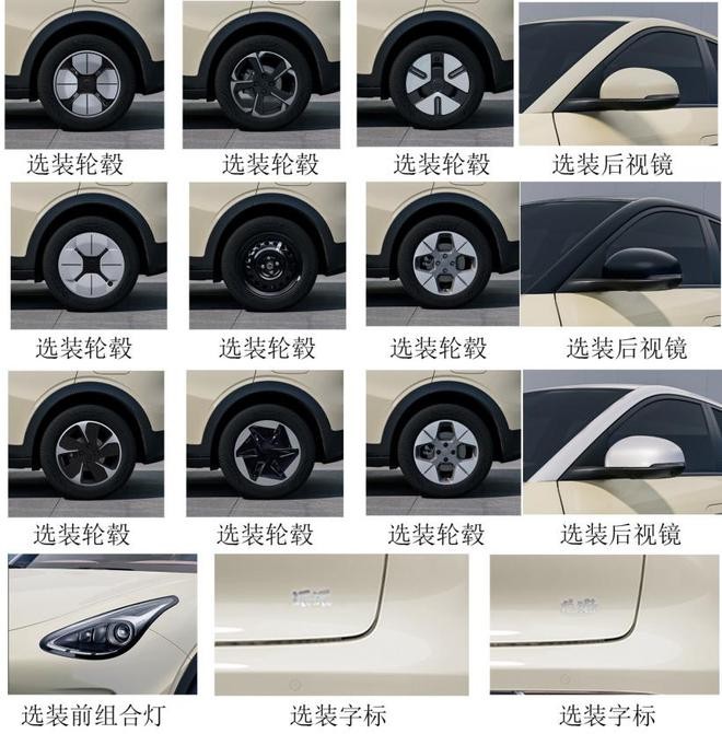 新車(chē)可選雙色或單色車(chē)身,長(cháng)寬高分別為 4135/1805/1570mm,軸距 2650mm;提供了豐富的輪轂樣式供用戶(hù)選擇,包含多款 4 輻、5 輻、6 輻樣式。此外,該車(chē)還提供了“派派”“龍貓”兩種尾標供選擇,預計為該車(chē)的備選名稱(chēng)。