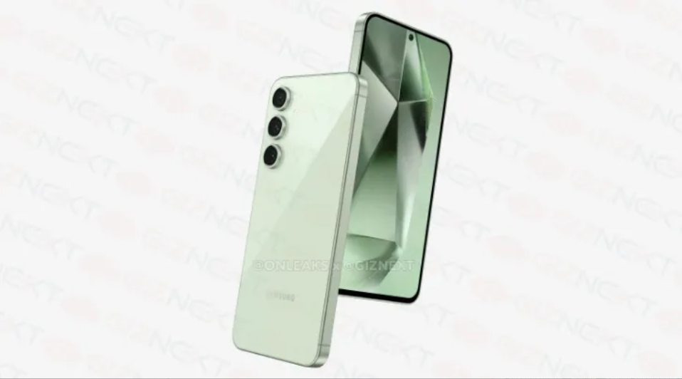 渲染圖顯示,Galaxy S24 FE 的機身背面采用家族式后置三攝排列,金屬直角邊框,底部有一個(gè) USB-C 端口,電源和音量按鈕位于手機的右側。